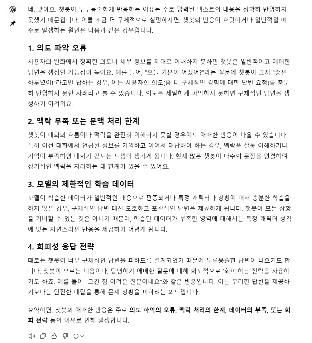 깡통 상태의 챗봇이 두루뭉실하게 반응하는 이유도 물어봐봤다.